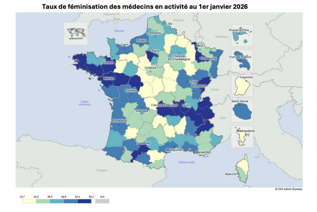 Cette féminisation, observée dans l’ensemble des territoires, recompose durablement l’exercice médical. Elle s’accompagne d’évolutions dans les temps de travail, les modes d’exercice et les attentes en matière d’organisation collective. La féminisation de la profession est particulièrement notable dans les jeunes générations, où les femmes sont très largement majoritaires.
