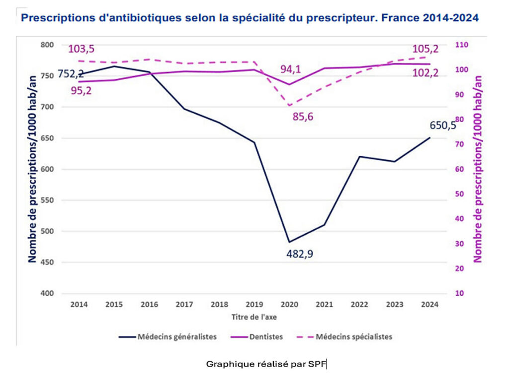 La consommation d’antibiotiques en médecine de ville a augmenté de 5,4% entre 2023 et 2024, retrouvant les niveaux d’avant Covid, selon Santé publique France. En 2024, 27,2 millions de personnes (40% de la population) ont reçu au moins une prescription. Cette hausse contredit les recommandations de réduction des durées d’antibiothérapie.
